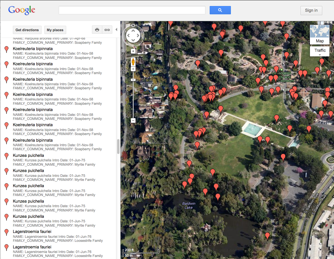 “Satellite” view of the Google map of the locations of Arboretum introductions. Keep zooming in to see the paths, roads and landmarks in the Arboretum grounds.