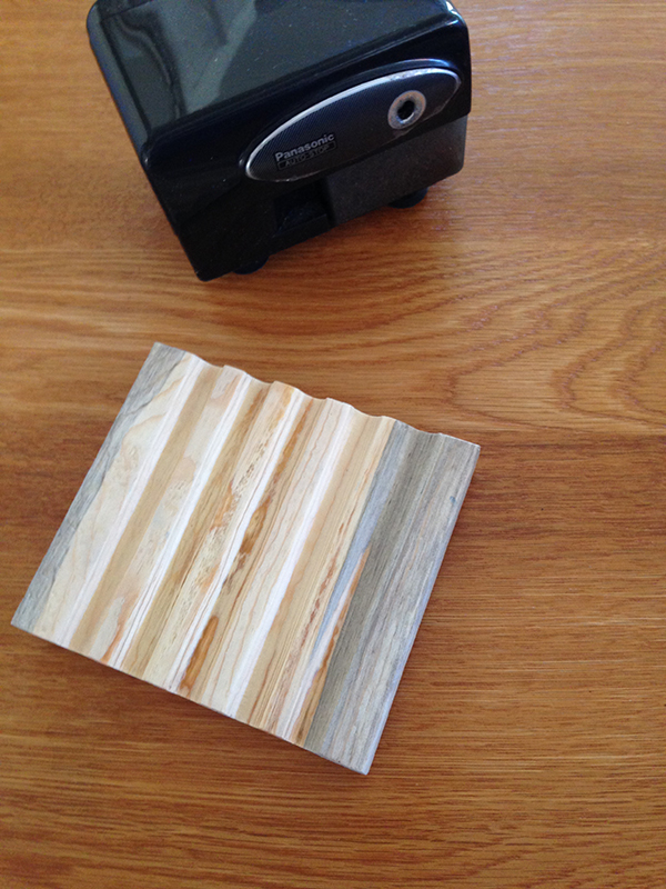 [Brush holder back] Susan Fisher explained that the wood came from pine trees harvested after being killed by Mountain Pine Beetles (Dendroctonus ponderosae), native to the forests of western North America. The blue color of the wood is the result of staining from the beetle infestation. Libby Kyer designed the logo on the back, which was also on the water bottles donated by Libby and her husband. Photo by Deb Shaw.
