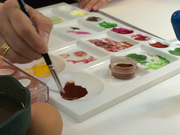 At the Denver Botanic Gardens, Laurence Pierson demonstrated egg tempera on gesso panel. She mixes dry pigment with water using a colour shaper, adds a bit of alcohol if the particular pigment requires it to dissolve, and mixes in a bit of egg yolk.