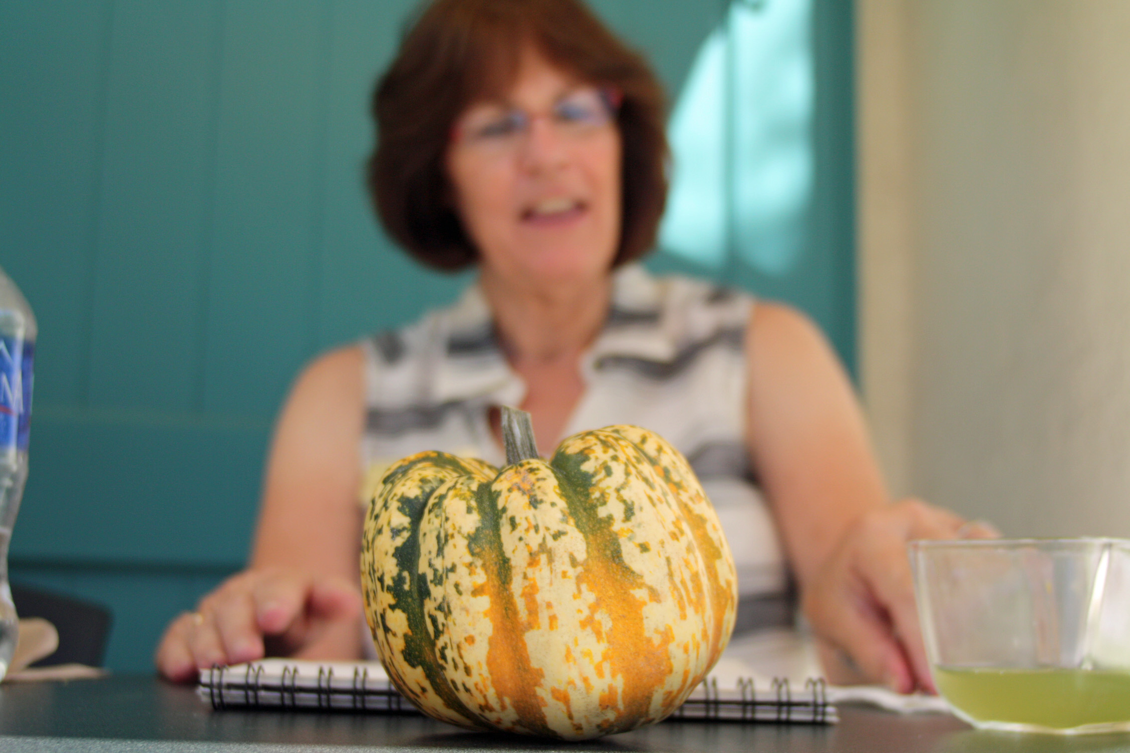 Diane Daly demonstrating botanical art with a fall squash. Photo by Lori Vreeke, © 2015.