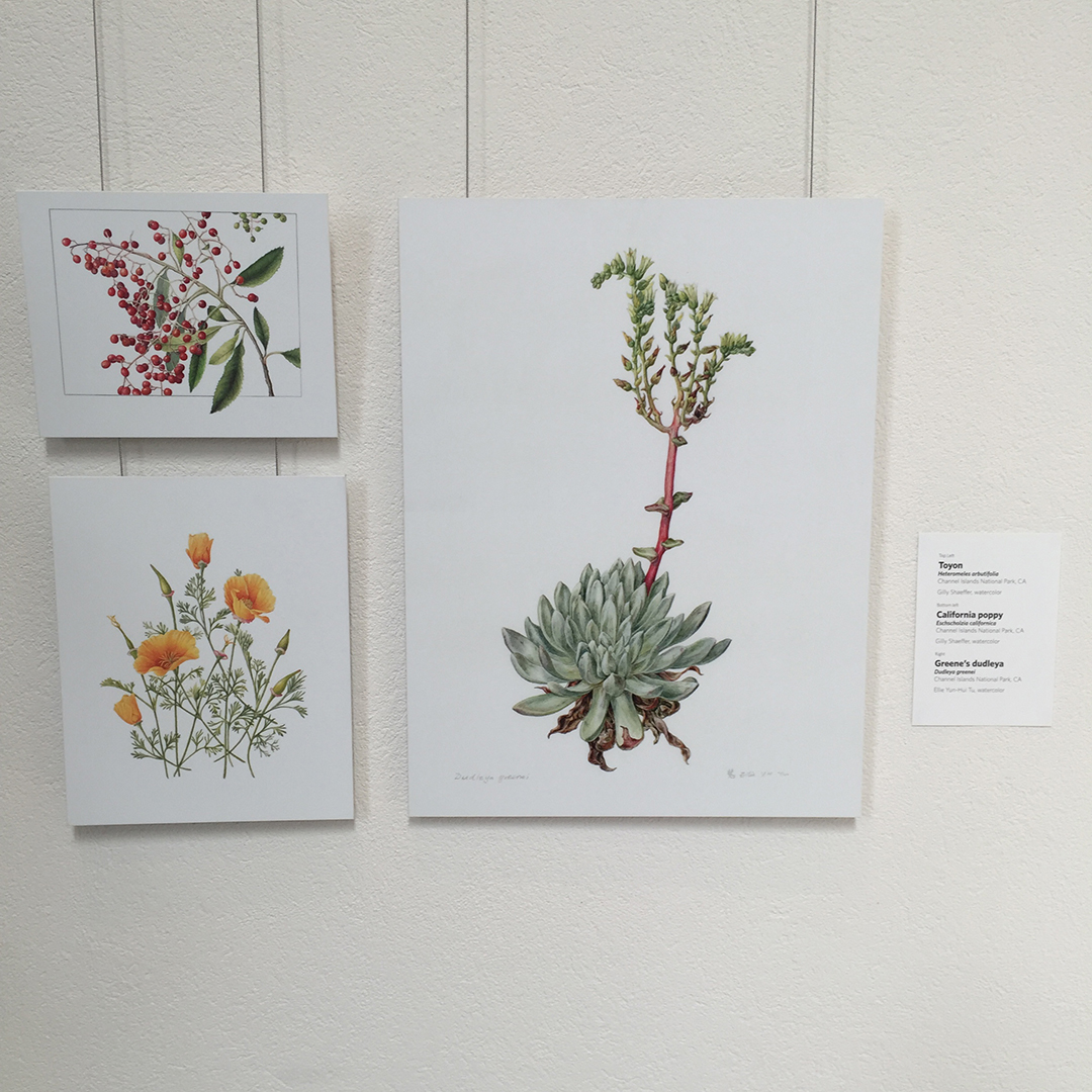 Gallery wall showing Dudleya greenei by Ellie Tu; and California Poppy and Toyon Berries by Gilly Shaeffer. © 2016 by the artists, all rights reserved. Photo by Keith Fisher, © 2016.