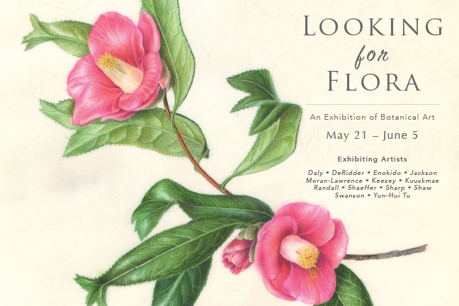Invitation postcard for “Looking for Flora,” Roger’s Gardens. Watercolor on vellum by Akiko Enokido, Camellia japonica ‘Kingyoba tsubaki’, © 2016, all rights reserved. Download the complete postcard here.
