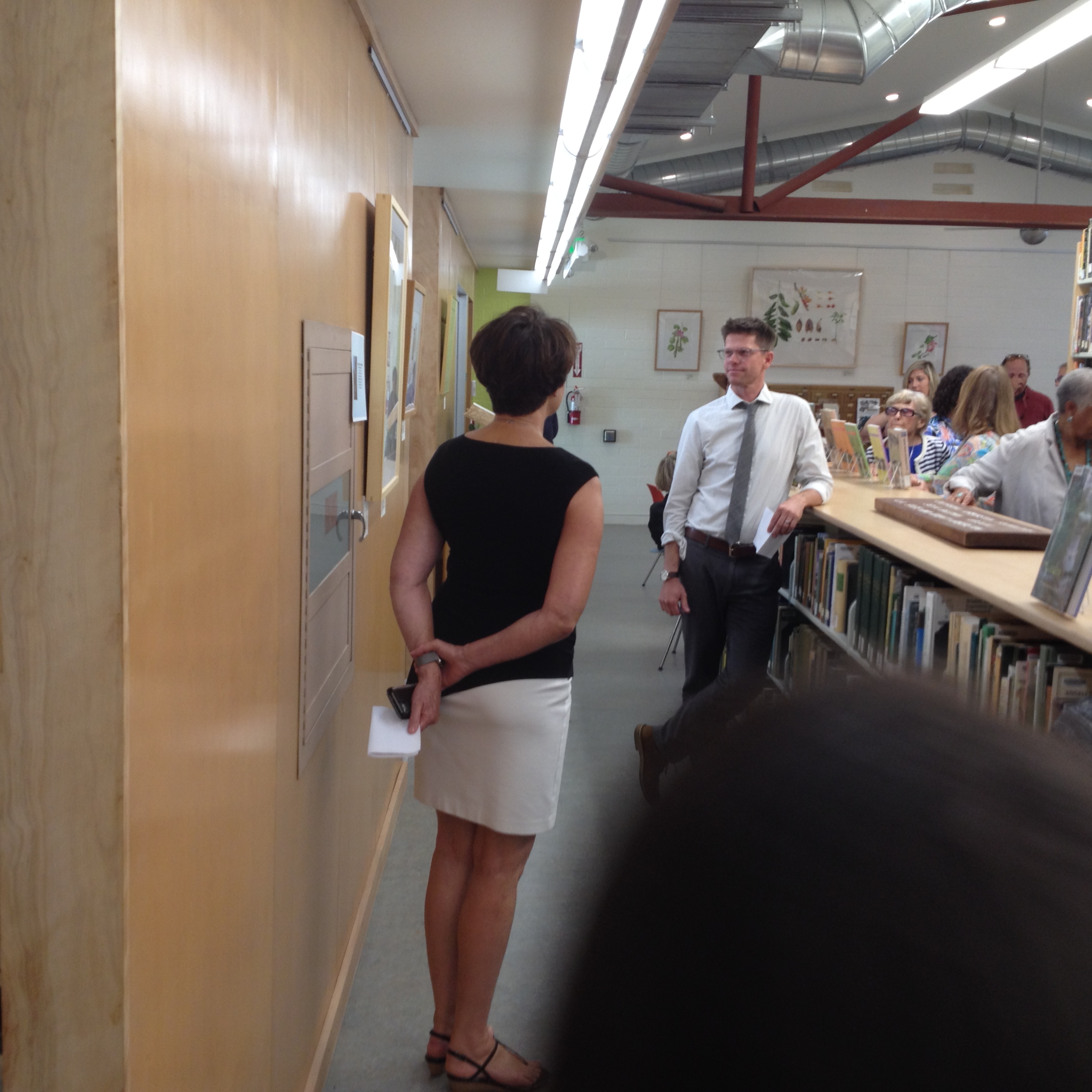 Matt Ritter discussing Janice Sharp’s Eucalyptus racemosa, Scribbly Gum, and why the scribbles disappear when the tree is grown away from Australia, watercolor/gouache on paper.