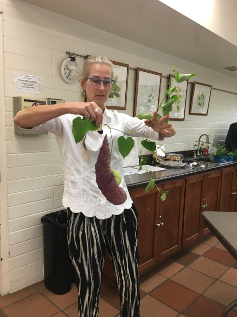 Lesley Randall discussing the intricacies of the Aristolochea gigantea. Photo by Jude Wiesenfeld, © 2018.