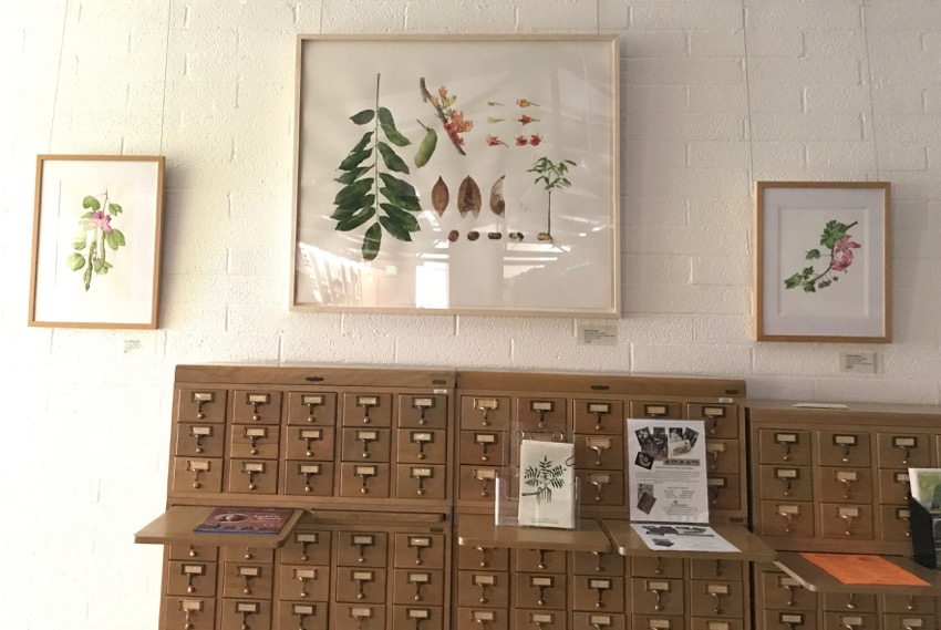 Artwork hanging above the card catalog in the Arboretum Library. Artists are: (L to R) Diane Nelson Daly, Deborah Shaw, and Estelle DeRidder. Photo by Janice Sharp, © 2017.