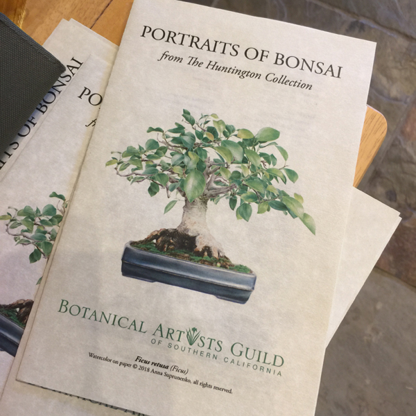 BAGSC handouts for “Portraits of Bonsai from The Huntington Collection.” Cover image, Ficus retusa, watercolor on paper, © 2018 Anna Suprunenko. Brochure and photo by Olga Ryabtsova, © 2018.