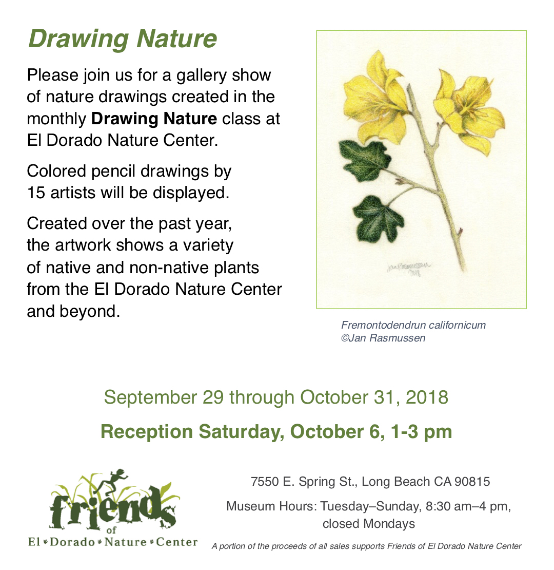 “Drawing Nature,” an exhibition of artwork created in Nina Antze’s colored pencil classes at the El Dorado Nature Center will close on October 31, 2018.