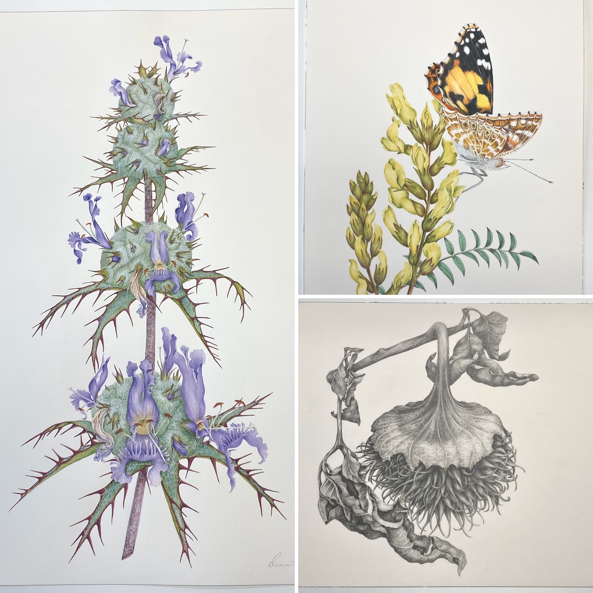 Donnett Vanek, © 2020, all rights reserved. Clockwise from left: California Thistle Sage, dry brush watercolor; Painted Lady & San Joaquin Milkvetch, dry brush watercolor; Dried Jimsonweed seed pod, graphite