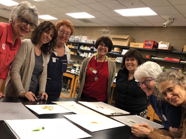 Reviewing artwork with Carrie Di Constanzo. L to R: Teri Kuwahara, Carrie Di Costanzo, Suzanne Bassani, Janice Sharp, Carol Readhead, Mary Jo Newman, Melanie Carter-Campbell. Missing from photo: Patricia Mark, Alyse Ochniak. Photo by Kathlyn Powell, © 2018.