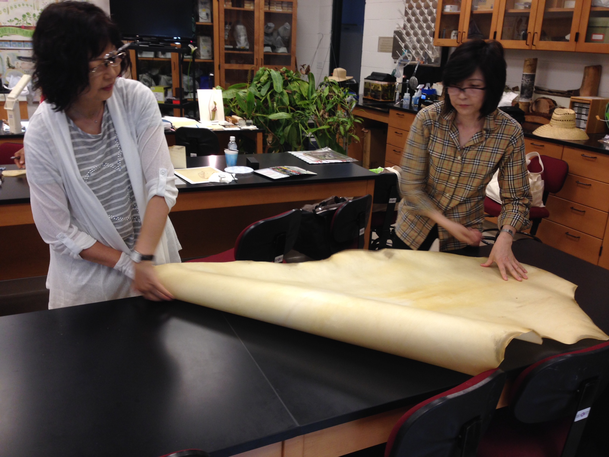 Meiko Ishikawa and Akiko Enokido unroll Reindeer Vellum to show the class what a whole skin looks like.