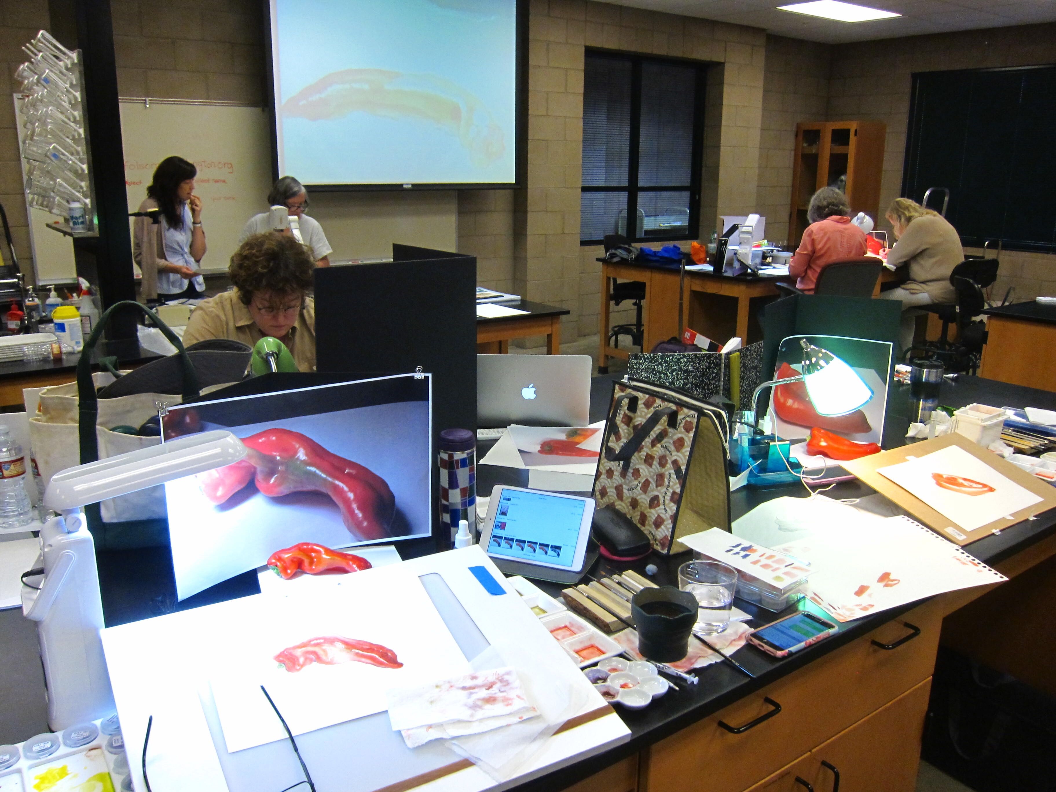 An enthusiastic group of artists enjoyed three days with Elaine Searle for her class entitled “Liquid Shine…Sculpting Form with Light and Color”. This was one of two Weird, Wild & Wonderful pre-symposium classes held at The Huntington this week. Gilly Shaeffer searched everywhere until finally her artist’s eye found beautiful Italian peppers for our studies. The class explored the differences between Sheen, Shine and Liquid Shine learning a host of indispensable techniques and tips.