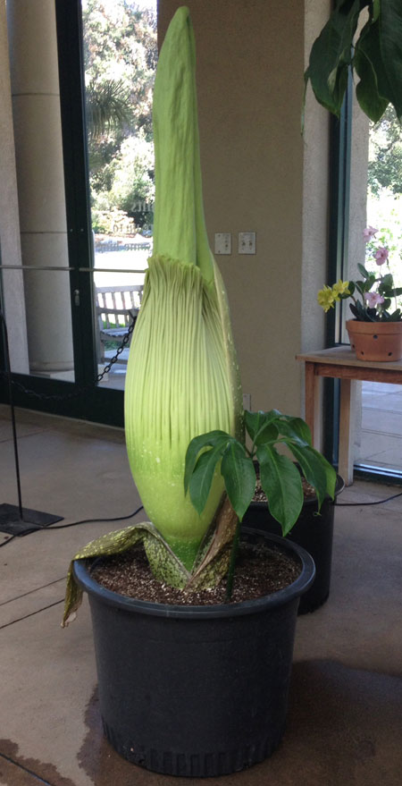 The Huntington Library, Art Collections and Botanical Gardens is hosting their fifth bloom of Amorphophallus titanum, the Titan Arum, or “Corpse Flower.” Renowned for its magnificent size and exceptionally foul odor, the Amorphophallus titanum flower can grow to be more than six feet tall, with a diameter of three to four feet.