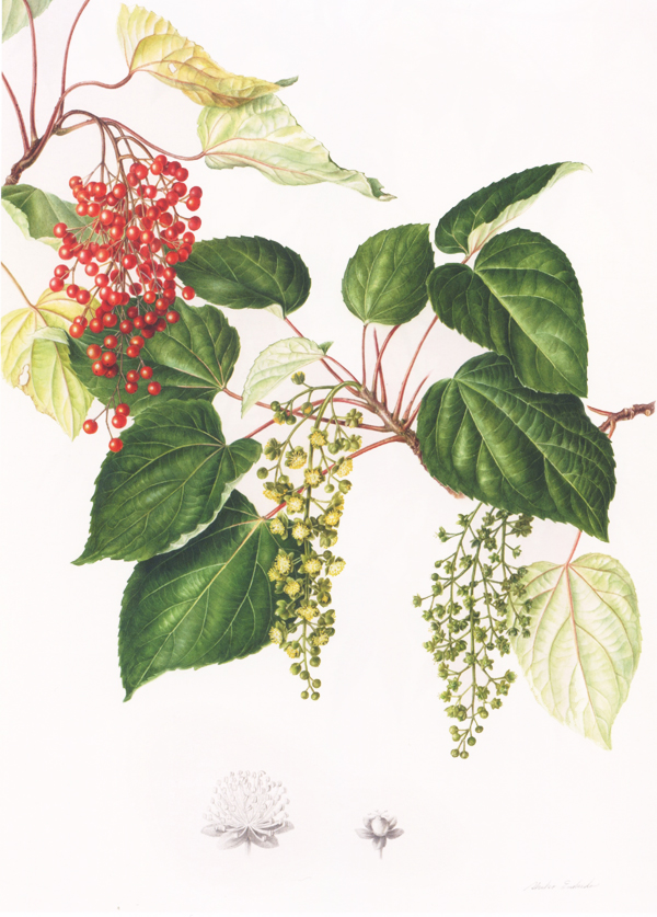 Take a look at the watercolor Idesia polycarpa by Akiko Enokido. I think the actual plant (not her painting!) is very modest looking. Its male and female flowers are especially small and plain. However, if you look at it up-close as Akiko did, it is obvious that the flower clusters are very gorgeous! Akiko successfully converted the modest look of the plant into a dynamic figure using her vivid and strong color. The beauty is sometimes there in front of us, but it doesn’t reveal itself until we open our eyes properly. I think as artists we have the wonderful power to help open the secret door, clearing the smoke that hides nature’s beauty.