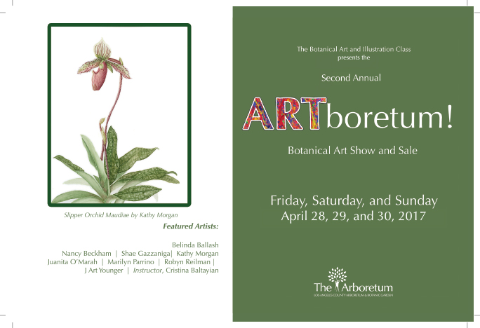 The Botanical Art and Illustration Class of the Los Angeles County Arboretum is proud to announce their Second ARTboretum Art show, an annual art exhibit and sale to be held Friday April 28 through Sunday, April 30 from 10 am – 4:30 pm, and 10:00 am until 2:00 pm on Sunday. Last year’s first event was an amazing success, with more than 60 works of framed art available for purchase, demonstrations, a reception, and sales of beautiful cards and prints of the artists work. More than 700 people attended this three-day event.