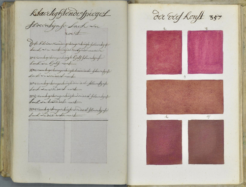 Titled Klaer lightende Spiegel der Verfkonst, or Traité des couleurs servant à la peinture à l’eau, the manuscript is a visual feast of color and calligraphy. Luckily, every page is available to view online in high resolution, zoomable images on e-corpus.org. The original volume resides in the archives of the Bibliothèque Méjanes in Aix-en-Provence, France. The bibliography for the book contains references to the Dutch East India Company, European textile export to India, and Indian textile export to Europe. Erik Kwakkel has translated part of the introduction; the book was intended to be an education guide to color.
