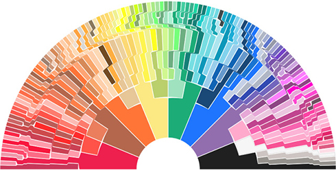 Stephen Von Worley’s graphic showing the expansion of Crayola colors from the original eight crayons. To view an interactive graphic, where rolling your mouse over a color displays the color’s name, go to: http://www.datapointed.net/visualizations/color/crayola-crayon-chart-bow/