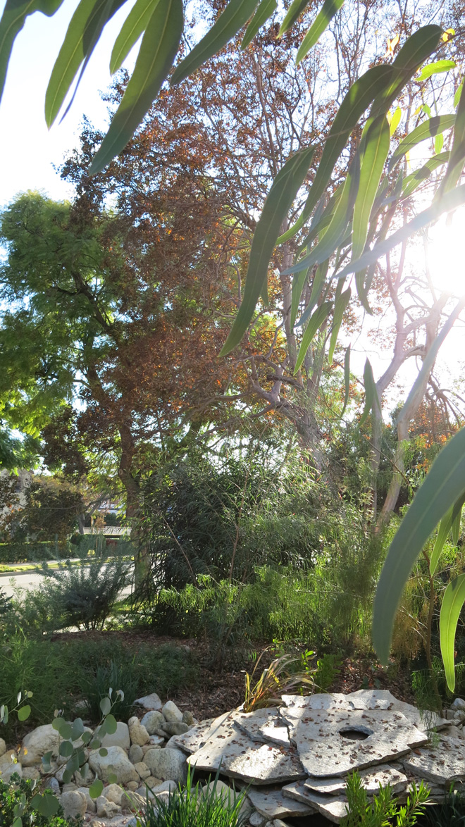 Another major influence on my thinking was the Mediterranean Garden Society/Pacific Horticulture 2010 Symposium at the Los Angeles Arboretum. This Symposium’s speakers, the local garden tours, the gorgeous Australian plants grown by Jo O’Connell, and conversations with people about gardens changed my life, within the already transformative context of researching Chinese gardens. These experiences convinced me to install drip irrigation for the entire garden. “Woolly Pockets” I saw at the Symposium helped me create vertical gardens on walls and balconies, and further online searches led me to “Smart Pots,” made of recycled plastic bottles, to use as larger containers. I decided to use Australian native plants for my garden upon seeing their poetic textures, remembering them from my childhood, recognizing their symbolic otherness, and their significance to plant evolution and the geologic history of our planet. These plants evoke ideas held in the Dreamtime: origin stories of creation, ancestral voices, relationships between humans and nature, and spiritual quests toward Oneness.