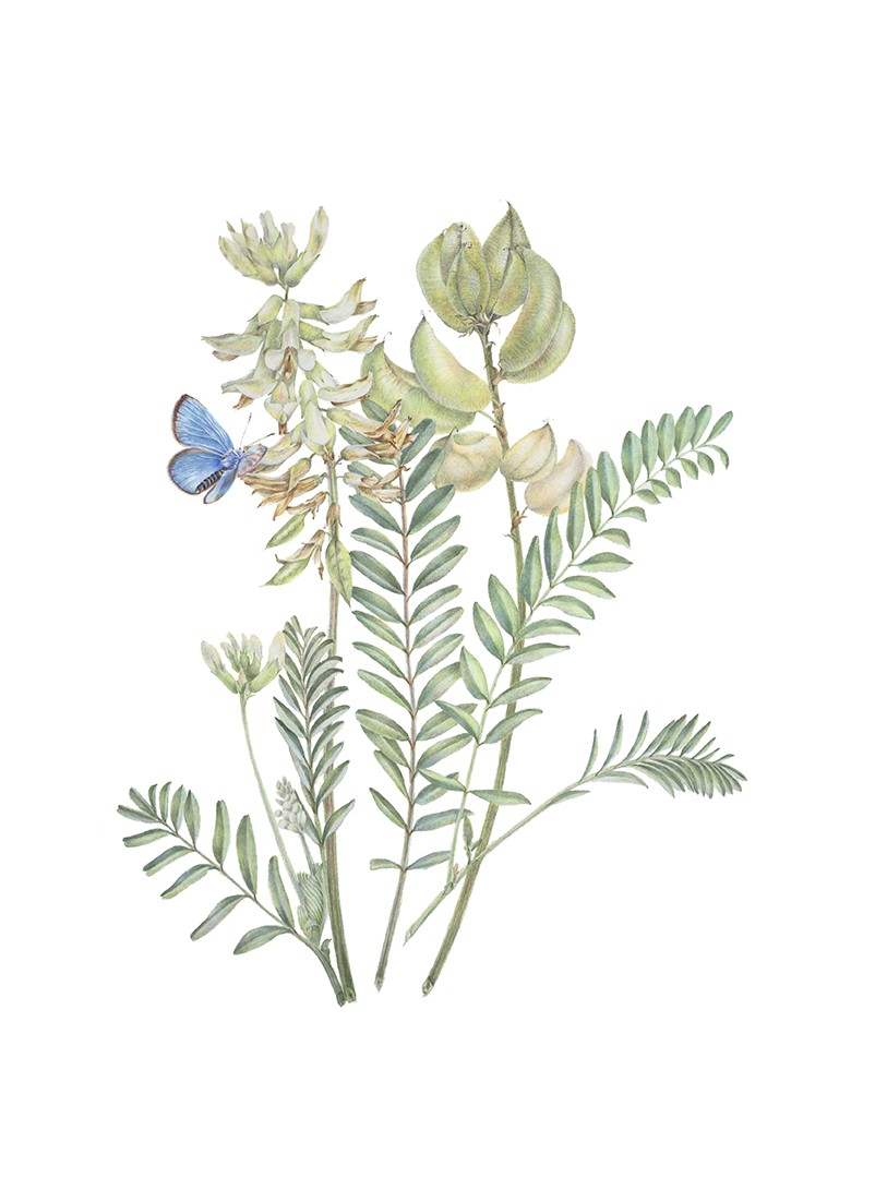 Astragalus trichopodus with Glaucopsyche lygdamus palosverdesensis, Common names: Locoweed with Palos Verdes Blue Butterfly. Estelle De Ridder, © 2014, all rights reserved.