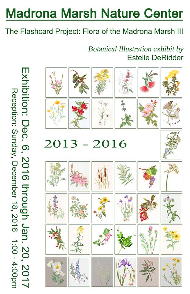 Estelle is now exhibiting the complete project at the Madrona Marsh Nature Center. Titled The Flashcard Project: Flora of the Madrona Marsh III, the exhibition runs from December 6, 2016 through January 20, 2017. There will be an opening reception Sunday, December 18, 2016