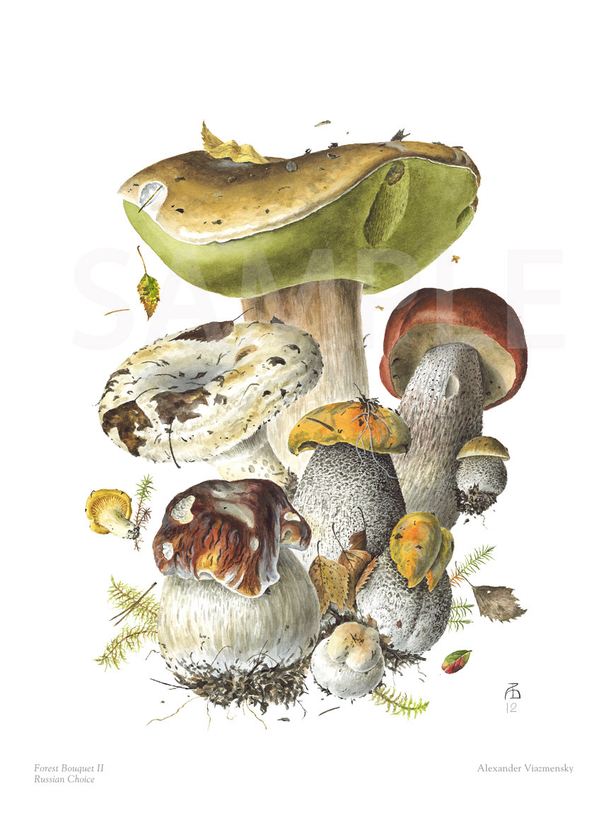 Sasha Viazmensky was born and lives in St. Petersburg, Russia, and specializes in painting fungi. Although he has a Master’s Degree in Electrical Engineering, he has devoted his life to painting, studying, and picking mushrooms. His work is included in the collections of the Hunt Institute for Botanical Documentation in Pittsburgh, the Minneapolis Institute of Arts, the Shirley Sherwood Collection and the Komarov Botanical Institute in St. Petersburg, among others, and in private collections all over the world. You can read an article Sasha wrote about picking mushrooms in Russia, published in MUSHROOM, The Journal of Wild Mushrooming, here.