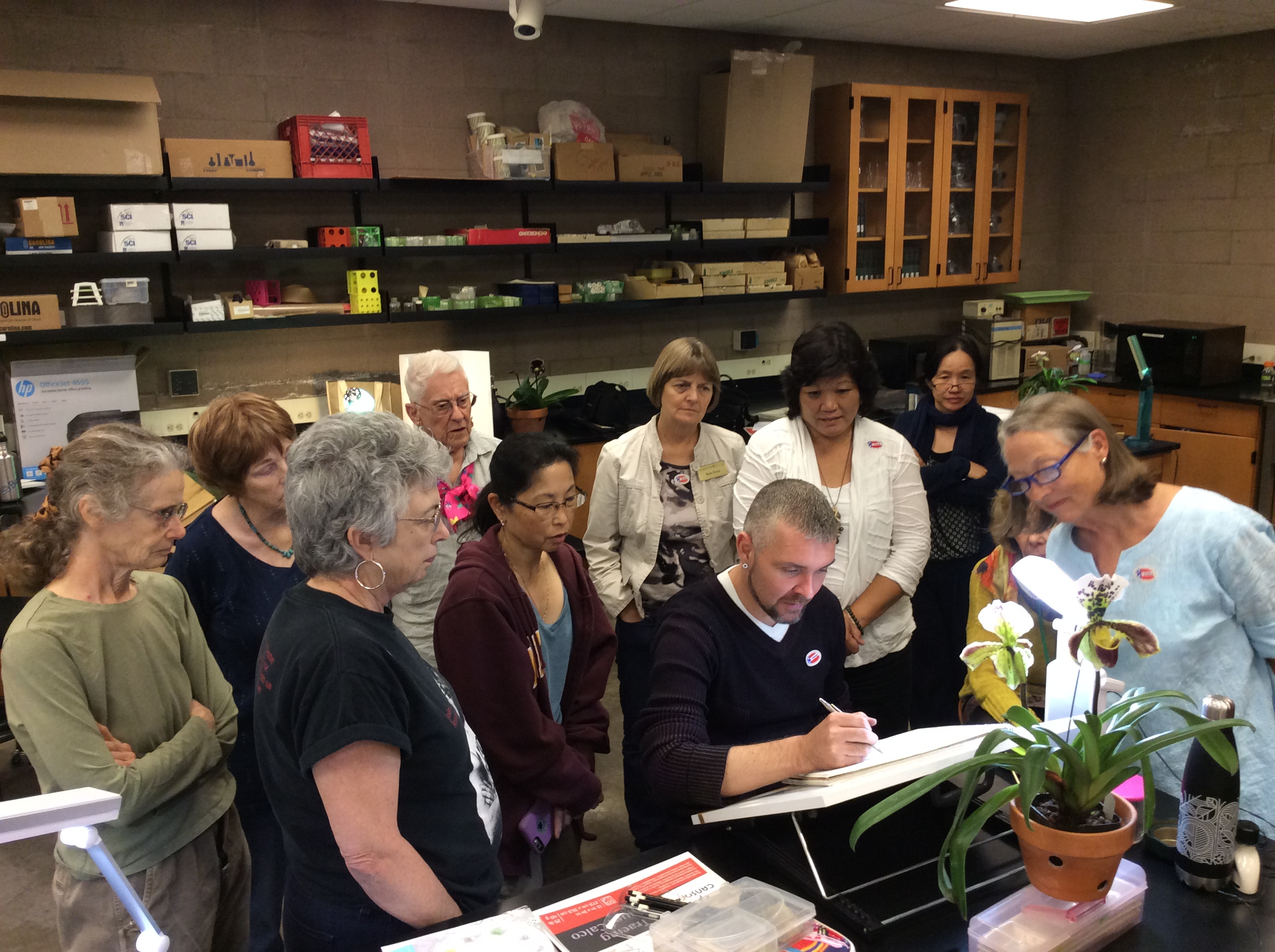The renowned Huntington Library, Art Collections and Botanical Gardens provided fourteen BAGSC members with a three-day Master Class with John Pastoriza-Pinol on November 8 – 10, 2016. The Huntington offered us exquisite Paphiopedilum specimens from the Conservatory and greenhouses for our subjects. Kudos to Melanie Thorpe of The Huntington, and BAGSC Education Chair Jude Wiesenfeld, for flawless organization on this long-anticipated workshop.