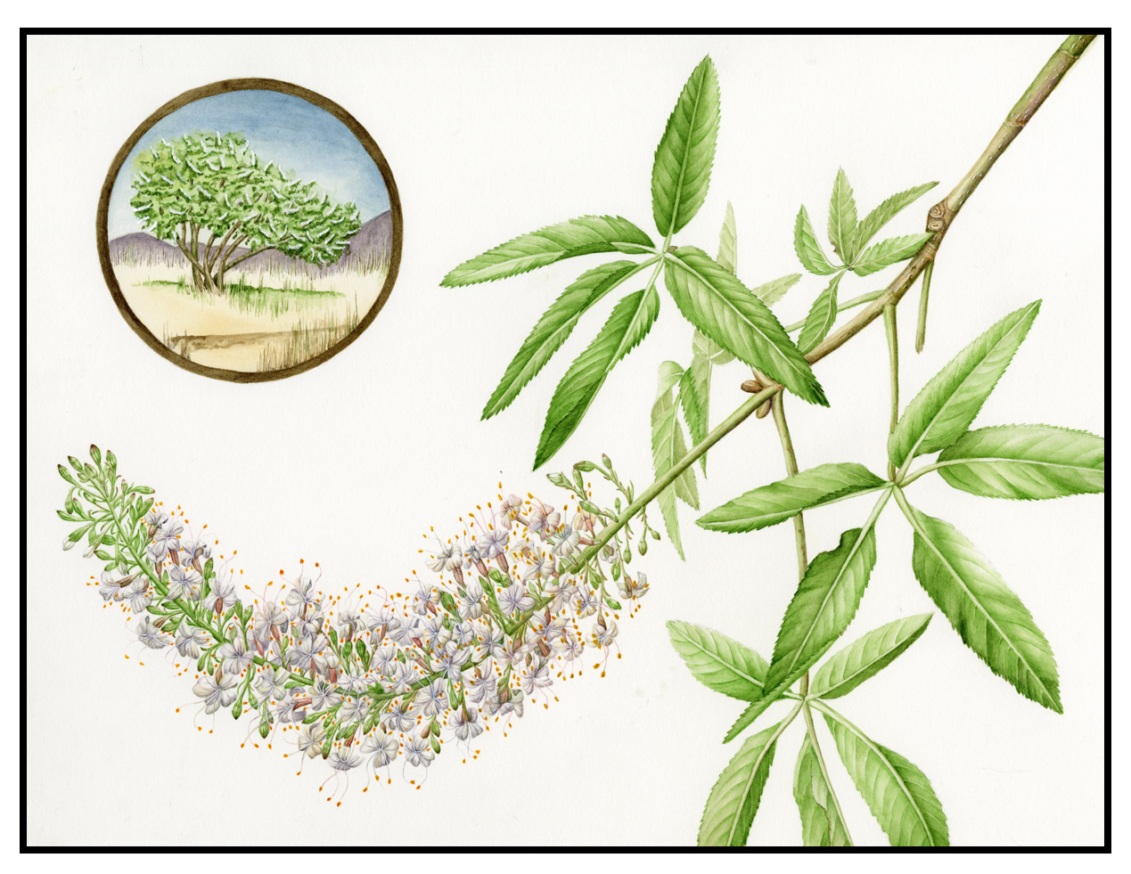 California Buckeye Flower, Aesculus californica; Flannel Bush, Fremontodendron; California Poppy Eschscholzia californica; Foothill Penstemon, Penstemon heterophyllus; or Heart Leaf Penstemon, Keckiella cordiforlia; Toyon, Heteromeles arbutifolia; Bush Monkey Flower, Mimulus aurantiacus
